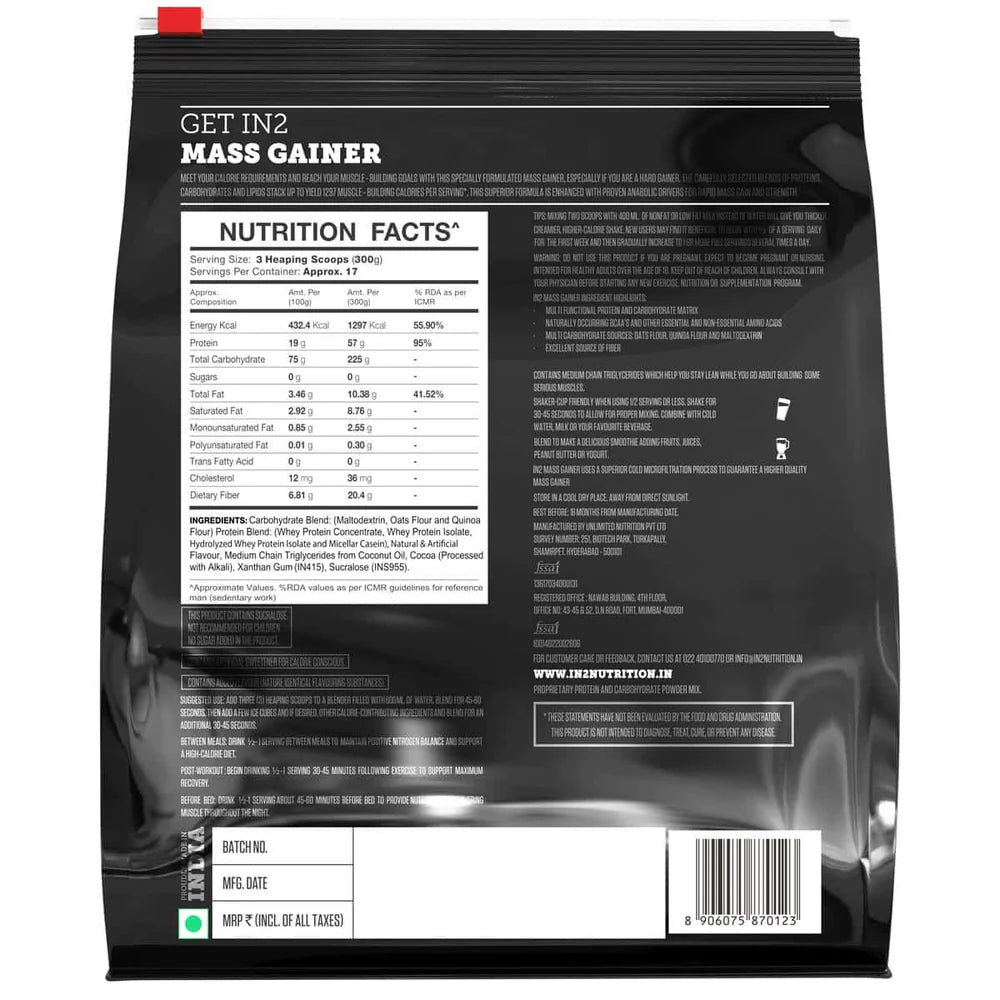 Meet your calorie requirements and reach your muscle-building goals with this specially formulated IN2 Mass Gainer, especially if you are a hard gainer. IN2 Mass gainer helps in Prevention of catabolism by aiding muscle building and recovery. Packed with high quality calories from multiple carbohydrate source: Oats flour, Quinoa flour, Maltodextrin which maintain a sustained supply of energy for muscle growth. Multi Functional protein source with a blend of Concentrate, Isolate, Hydrolysed whey protein isolate and miscellar casein helps in speedy muscle recovery and maximize muscle size. Naturally occurring BCAAs and other essential and non essential amino acids. This weight gainer is enhanced with MCTs that can be easily digested and rapidly used for energy.